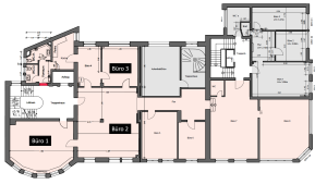 The team office has its own separate entrance and offers space for up to four workstations. The bright room is connected via a second door to the coworking area, where conference room, kitchen and lounge areas are available for use. This is office 1 on the floor plan.